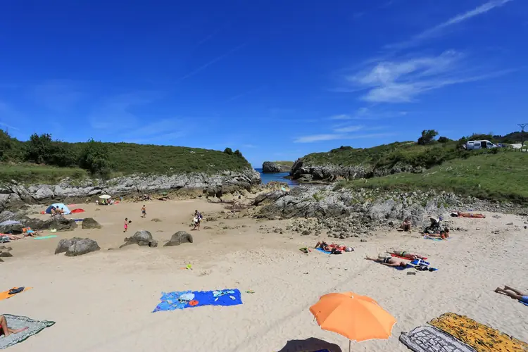 Playa España. En un entorno de prados y grandes acantilados se enmarca la playa España, sometida a un potente oleaje, en la que la proximidad de un camping explica la considerable afluencia de veraneantes a ella. Características generales: ..